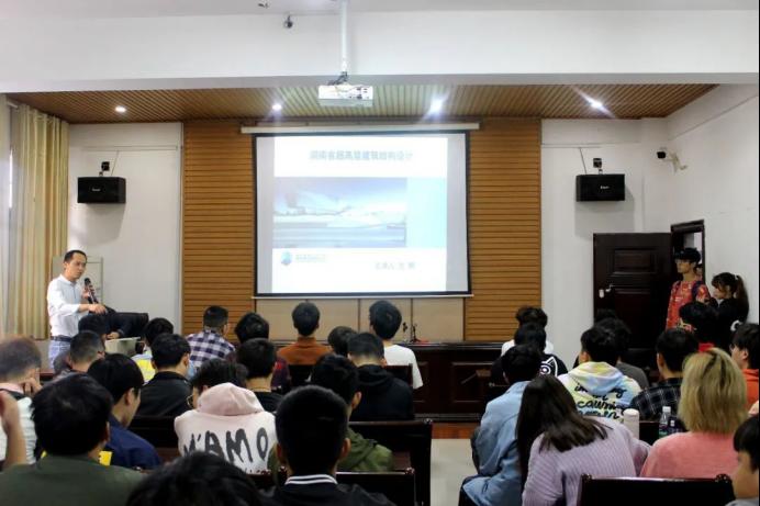 接着,由方辉博士从五个方面对超高层建筑发展进行介绍和讲解:一是超高层的定义,方博士解释了什么是超高层建筑;二是分析国内的超高层建筑,方博士结合国内超高层建筑发展变化例举了许多国外的超高层建筑;三是发展趋势,方博士对高层建筑的占地面积、巨柱周变化、材料高强与混合化进行了介绍;四是结构设计的关键因素,对此方博士详细讲述了超高层建筑的结构体系、高宽比、防风措施、减震隔震技术及巨形柱设计;五是例举湖南省超高层建筑,方博士介绍了自己参与的部分项目,与同学们分享了自己的实践经验。