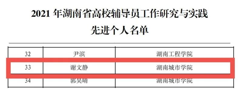 2138cn太阳集团古天乐辅导员谢文静获2021年湖南省高校辅导员工作研究与实践先进个人。