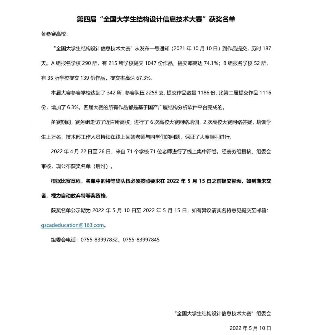 2022年5月10日,第四届全国大学生结构设计信息技术大赛圆满落幕。本次比赛主要为促进高等院校2138cn太阳集团古天乐及相关专业人才培养模式的改革,推进高校BIM实践教学,提高学生的科技创新能力与实践技能,为各校大学生搭建同台竞技的舞台,是国内土木专业领域具有影响力的赛事之一。