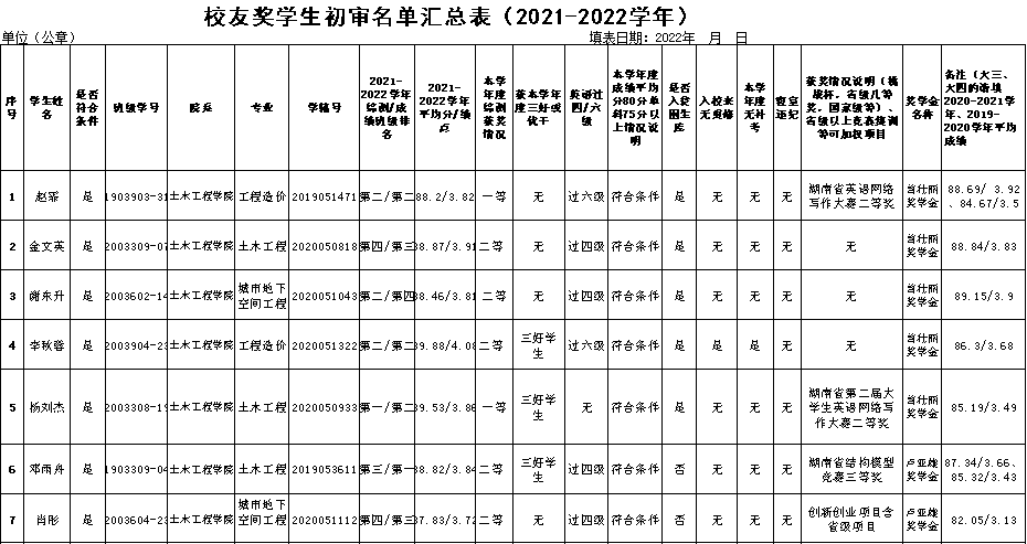 按照学校《关于做好2022年校友奖学金评审工作的通知》要求,经个人申请、辅导员评议,拟推荐1903903-31赵霏、2003309-07金文英、2003602-14谢东升、2003904-23李秋蓉、2003308-19杨刘杰等5名同学为曾壮丽奖学金获得人选,1903309-04邓雨舟、2003604-23肖彤、2003601-28周仁翠、1903315-01吕城等4名同学为卢亚雄奖学金获得人选,2103202-30伍书瑶为候补。