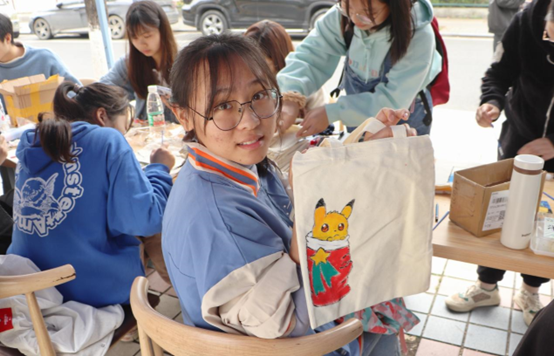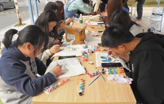 本次活动前期通过招募志愿者制作了许多手工艺品,如DIY环保帆布袋、手链、香囊等。活动当天志愿者们在新食堂门口摆台,一边通过简单的互动游戏赠送礼物,一边现场和同学们一起制作自己想要的手工艺品,活动现场精彩纷呈。