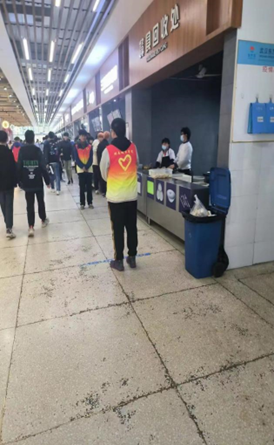 在学校新食堂餐具处理点,志愿者们认真值守,用礼貌文明的话语劝导在食堂就餐的同学们文明就餐并将餐具放置到回收处,让同学们深刻意识到“文明用餐,你我共创”的重要性及必要性。这次活动不仅营造了食堂更加整洁的就餐环境,并且强化了同学们的文明节俭意识。