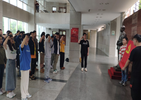 会后,二支部全体成员在一教学楼大厅毛泽东铜像前集合,面向党旗、举起右手,重温入党誓词。