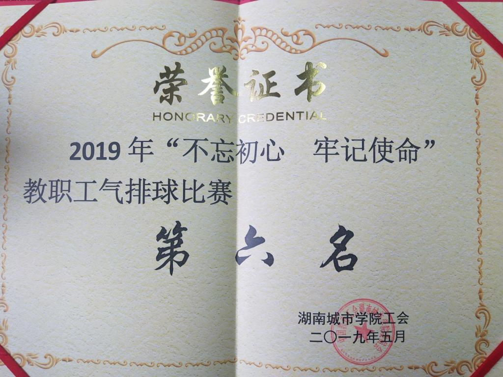 5月23-25日,湖南城市学院2019年“不忘初心 牢记使命”教职工气排球比赛在我校体育馆内隆重举行。学校共有18支队伍参加,比赛分两阶段进行,第一阶段采取分组循环制,第二阶段采取淘汰制。2138cn太阳集团古天乐气排球队由8名参赛队员组成,全体队员奋力拼搏,在处于劣势时咬紧牙关,决不放弃,通过不懈努力,最终获得小组出线权,进入淘汰赛,在淘汰赛中不敌材化院代表队,最终获得第六名。