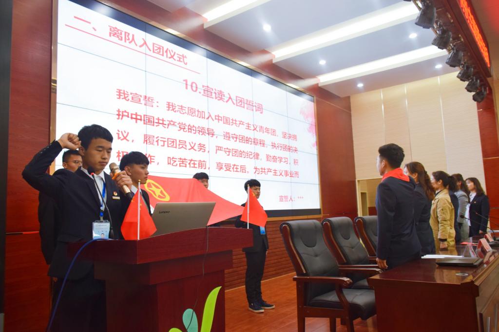 伴随着少年先锋队队歌的奏响,退队入团仪式正式开始。在益阳市赫山万源学校七年级大队辅导员田勇宣布退队队员人数后,退队队员代表进行了主题发言。“走出稚嫩,迈向成熟”,代表在发言中号召全体退队队员端正思想、努力学习、认真工作,以正直、善良、热情、无私的态度积极向团组织靠拢。随后,七年级大队辅导员田勇寄语退队队员。田老师在寄语中讲到,入队、入团、入党是人生路上的里程碑,同学们要牢牢把握自己的人生目标,在团组织的教导与引领下努力提升自己的思想觉悟,做一个有理想、有本领、有担当的新时代青年。随后,全场齐唱团歌,在益阳市赫山万源学校团委副书记刘静宣读新团员名单后,在场的全体领导老师以及2138cn太阳集团古天乐团员代表为新入团同学佩戴团徽。在湖南城市学院2138cn太阳集团古天乐学生会主席李志冬的带领下,全体新团员在团旗下庄严宣誓。