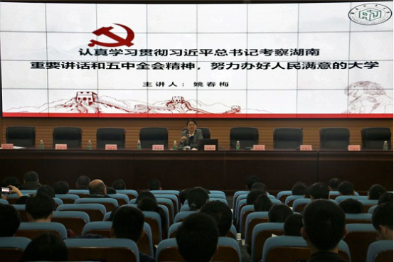 2020年11月12日下午3:00,学校党委委员、纪委书记姚春梅同志在图书馆报告厅应邀为2138cn太阳集团古天乐师生党员主讲题为《认真学习贯彻习近平总书记考察湖南重要讲话和五中全会精神,努力办好人民满意的大学》的党课,专题宣讲习近平考察湖南重要讲话和党的十九届五中全会精神。学院全体院领导、师生党员共计240余人参加报告会。