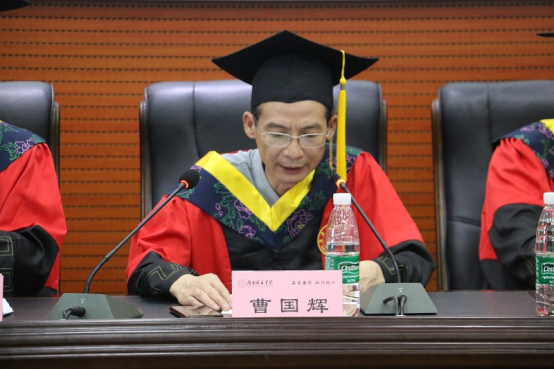 院长曹国辉致辞。曹国辉寄语广大毕业生,要肩负历史使命,坚定前进信心,立大志,明大德,成大才,担大任,努力成为担起民族复兴重任的时代新人,将青春和汗水奉献给祖国、民族、人民、人类,灌溉出不懈奋斗的绚丽之花。曹国辉对毕业生提出三点殷切希望:一是不忘初心,坚持终生学习,时刻关注行业、产业前沿知识和技术进展,勤学苦练、深入钻研,不断提高技术技能水平;二是知行统一,坚定报国,忠于人民,涵养家国情怀,将个人成长融入国家发展、民族复兴的洪流中;三是崇德修身,笃行实干,打牢道德根基,将社会主义核心价值观内化为自觉精神追求。