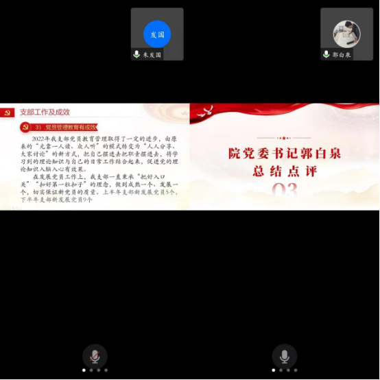党委书记郭白泉作点评。郭白泉对2022年度支部书记线上述职整体情况给予了充分肯定。他认为,尽管因疫情原因采取线上述职,缺乏线下的仪式感和现场氛围,但支部书记的述职从汇报的质量、效果,到PPT精心制作,较2021年又有了新的较大的进步。述职做到了紧扣基层党建重点任务,突出主题,把握重点,彰显特色,查摆问题,提出举措,明确方向。