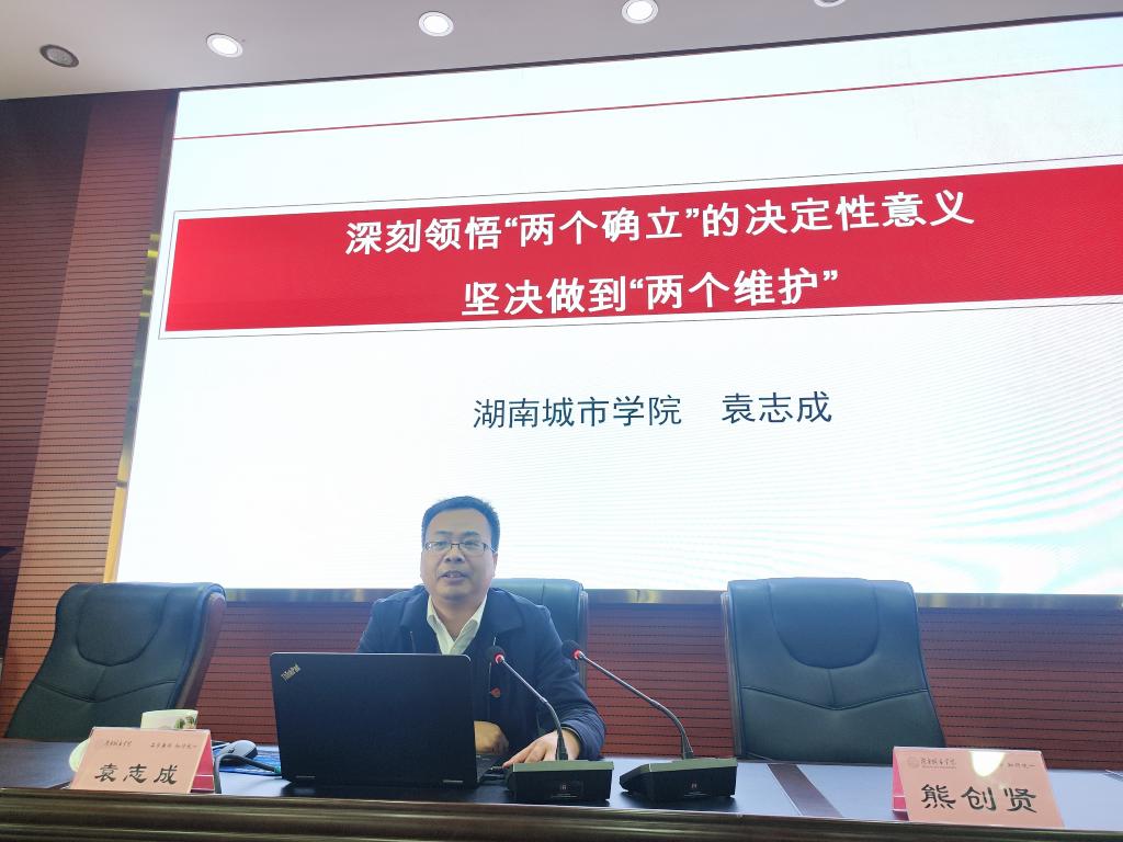 袁志成以《深刻领悟“两个确立”的决定性意义,坚决做到“两个维护”》为题,从“两个确立”是马克思主义政党的重大原则、“两个确立”是党百年奋斗经验的历史结论、“两个确立”是十八大后最重要的政治成果等三个方面进行了严谨细致的阐释。