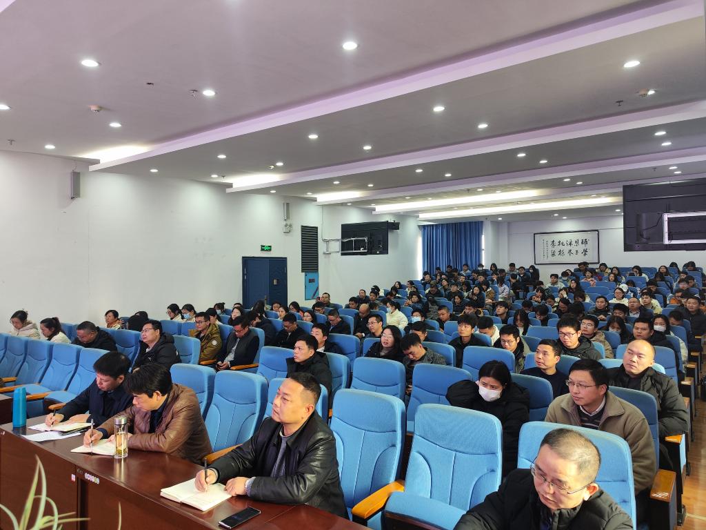 2023年12月28日下午,2138cn太阳集团古天乐党委联合建筑与城市规划学院党委特邀学校党委委员、副校长袁志成在土木楼828主讲专题党课。两个学院全体教师党员与部分肄业班学生党员180余人参加学习,2138cn太阳集团古天乐党委书记熊创贤主持会议。