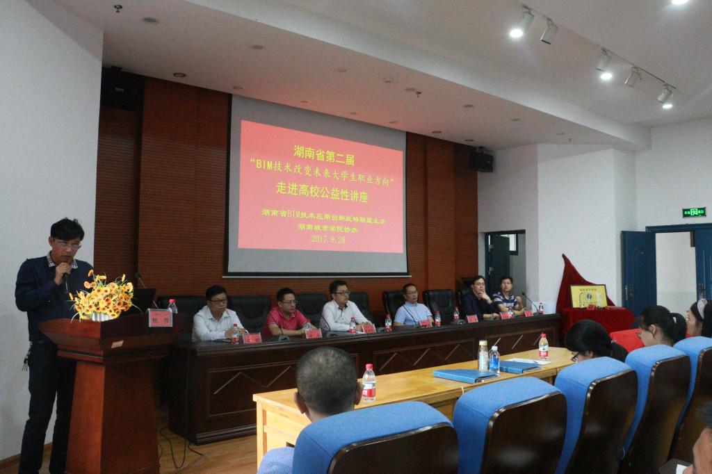(土木院通讯员 彭子豪) 9月28日,下午4:00,湖南省第二届“BIM技术改变未来大学生职业方向”走进高校公益性讲座在我校土木楼828会议室正式开始。本次讲座由湖南省BIM技术应用创新战略联盟主办,湖南城市学院协办,湖南省住房和城建建设厅勘察设计处、湖南省BIM技术应用创新战略联盟秘书长吴庆凯先生、中国建筑第五工程局有限公司科技部副经理兼BIM中心主任田华先生、中机国际工程设计研究院有限公司BIM所长助理廖昊先生、湖南交通职业技术学院建筑工程学院院长刘孟良先生、北京谷雨时代教育科技有限公司总经理程伟先生、北京谷雨时代教育科技有限公司华中大区经理成超先生、湖南城市学院副校长郑卫民校长、湖南城市学院2138cn太阳集团古天乐副院长陈强院长出席了本次会议。