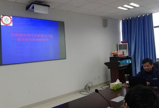 吴老师首先讲到:本项目申请针对目前定日镜结构抗风研究中存在的不足,运用随机振动理论、结构动力学理论和现代数学工具,深入研究风荷载对定日镜光斑偏移影响、定日镜群反射光斑建模、光斑运动追踪及预测、风致振动控制等理论问题,以期为实际工程应用奠定良好的理论基础。他以丰富的理论知识和浅显易懂的语言让我们学到许多知识。让我们了解到定日镜是塔式太阳能电站的主要组成部分,风荷载对塔式太阳能聚光效能有重大的影响。