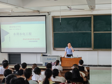 为了让同学们更深入地了解水利,爱上水利,特别邀请了一位水利行业专家,益阳市水利水电勘测设计研究院有限公司常务副总经理——庄稼,为大家分享了他的水利情怀。庄稼专家以“水利万物,因水而生”为主题,结合27年来在水利行业丰富的从业经历,通过PPT讲解和视频介绍,引经据典,给同学们讲述了水利与水利工程概况及我国水利的发展现状,让同学们对选择学习的这个专业以及可能从事的工作有了初步的了解。