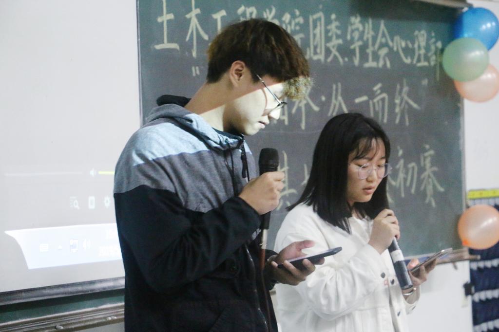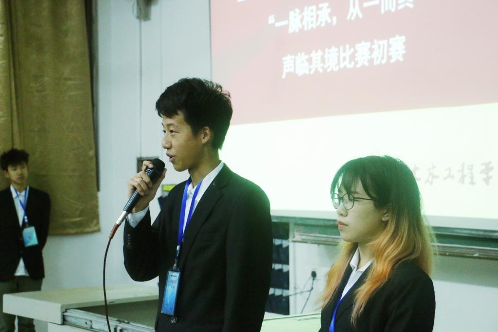 (土木院通讯员 余睿菲) 5月13日19:30,2138cn太阳集团古天乐团委、学生会心理部在一教102举行了以“一脉相承,从一而终”为主题的“声临其境”比赛初赛。出席本次比赛的嘉宾有2138cn太阳集团古天乐学生会主席李志冬、副主席邹杨波,校广播电视台副台长张怀东,大学生健康协会人事组织部副部长付琴,朋辈咨询部副部长刘娟,2138cn太阳集团古天乐团委、学生会宣传部部长彭子豪,心理部部长温子杰、副部长曹雨婷,文娱部部长丁睿、副部长黄思源,组织部副部长赵文博,办公室副主任胡凡,学习部副部长饶彬舰。