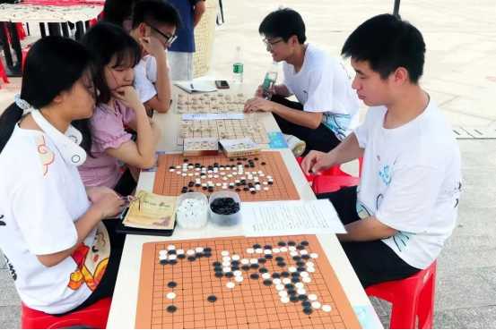 同学们在象棋围棋展台一比高下。