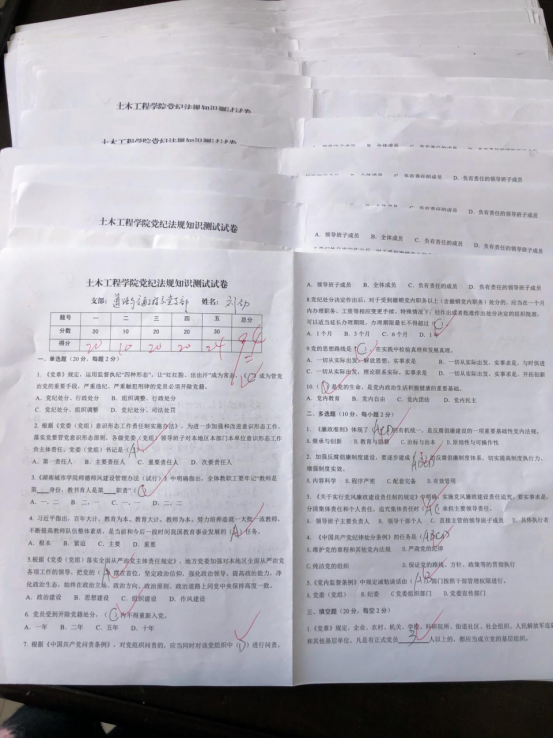 专题党课之后,组织全体参会的教职工党员进行了党纪法规知识专题考试。对于请假缺席人员,各党支部在规定时间内组织进行了补考,确保了党员应考尽考全覆盖,参考率100%。近期院党委组织专人集中评阅了试卷。统分结果显示,参加考试的84名教职工党员,平均得分90.7分,其中最高分98分,最低分80分。各党支部党员平均得分依次为:道路与交通工程系党支部92.8分;建工系综合办联合党支部90.2分;力学教研室党支部90.2分;地下空间系党支部90.1分;工程造价系党支部88.8分;实验中心党支部88.3分。