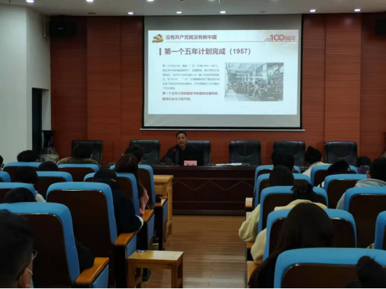 2021年11月25日下午,院党委在土木楼828组织主讲党史学习教育专题党课。院党委副书记黄智担任主讲,院党委委员、组织员徐丽苹主持,全体学生党员200余人参加党课。